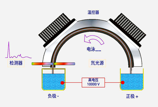毛细管电泳(Caillary Electrophoresis) 简称CE,是一类以毛细管为分离通道,以高压直流场为驱动力的新型液相分离分析技术。毛细管电泳(CE) 是由Jorgenson和Lukacs在1981年首先提出,他们使用了75mm的毛细管柱,用荧光检测器对多种组分实现了分离。毛细管电泳具有效率高、速度快、样品和试剂耗量少,应用面广泛等优点。