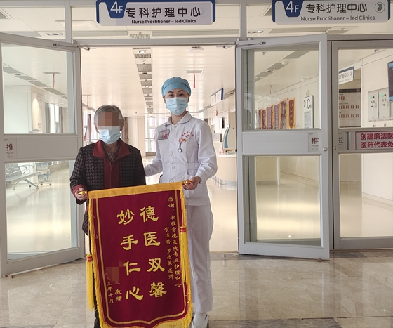 近日,高奶奶在家人的陪同下,将一面写着“德医双馨,妙手仁心”的锦旗送到湘雅常德医院门诊部专科护理中心,对罗方英副主任护师精湛的技术予以高度肯定,并对专科护理中心伤口造口护理门诊医务人员悉心的护理服务表示了由衷的感激。