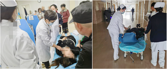 急救现场,5名医护人员分工协作,将患者平稳搬上平车,并密切观察杨女士的病情,为患者测得血糖5.4mmol/L,血压145/98mmhg,脉搏54次/分,同时给予氧气包加压给氧,并为患者推来抢救车。安保人员唐善平疏散人群,维持采血室秩序。10点18分,医护人员再次评估患者,患者神志转为清醒,能正确回答问题,自述没有吃早餐,没有力气,想吐、头晕,经询问该患者有晕针史。