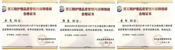 通过系统学习,护理部副主任金惠、外科片区科护士长郭蓉、急诊科主管护师苗雨获得第三期护理品质管理内训师培训合格证书。