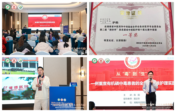 11月20日至22日,湖南省中医药和中西医结合学会急诊医学专业委员会2025年学术年会暨急诊危重症新进展学术研讨会在湖南怀化成功举办。会议同期举办了第二届“湘杏杯”急危重症中西医护理个案竞赛。湘雅常德医院急诊科护士陈阳首次代表科室护理团队参赛,以《从“毒”到“生”——一例重度有机磷中毒患者的全链条精准护理实践》为题作汇报,凭借扎实的内容与出色的表现,从众多参赛选手中脱颖而出,以全场最高分荣获一等奖。