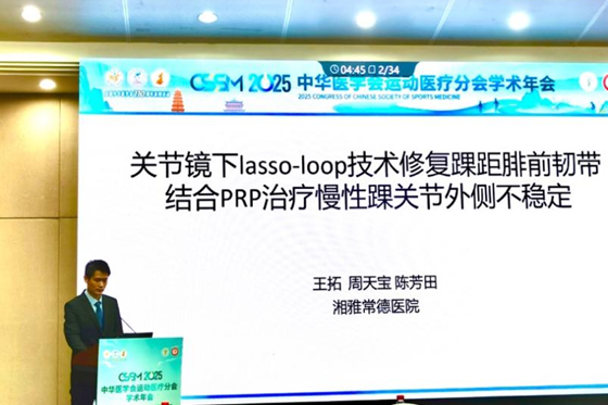 会上,中南大学湘雅医院骨科常德病区副主任医师王拓以“关节镜下lasso-loop技术修复踝距腓前韧带结合PRP治疗慢性踝关节外侧不稳定”为题作专题发言。王拓结合临床实践中的典型病例,系统阐述了慢性踝关节不稳的流行病学特征、诊断治疗要点,并重点分享了通过关节镜下lasso-loop缝合技术缝合固定距腓前韧带技术,再进一步结合踝关节腔富血小板血浆(PRP)注射,有效提升了韧带修复的稳定性与患者术后功能恢复效率,加快患者术后重返运动时间。该技术方案因兼具“微创化、精准化、快速康复”等优势受到与会同行的广泛关注与认可。