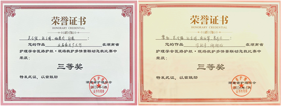 近日,在省卫健委、省国资委、省疾控联合举办的“湖南省首届职业健康医防融合创新大会”分会场——由湖南省护理学会组织的“医路护航·现场救护多情景联动急救比赛”中,湘雅常德医院护理部及急诊科选送的演讲+急救包扎情景剧、儿科选送的海姆立克急救情景剧,从全省54家参赛单位中脱颖而出,双双荣获三等奖。