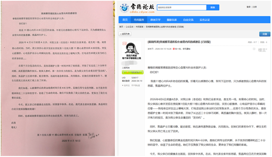 患者家属在感谢信与论坛帖文中,用朴实而真挚的语言,完整还原了凌晨抢救的紧张场景,字里行间满是对两位护士专业担当与温情守护的感激,同时对科室医护团队的救治能力和医者担当赞不绝口。家属直言,是医护人员的坚守与付出,守住了他们家庭的完整与团圆。