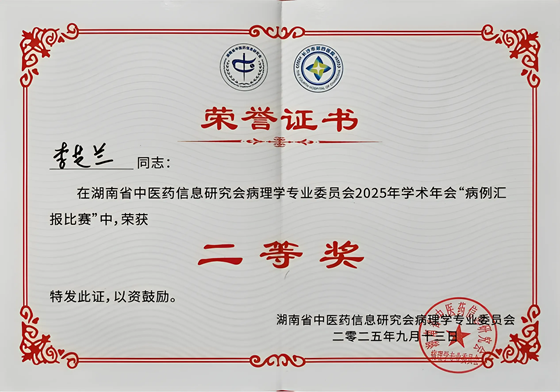 近日,湖南省中医药信息研究会病理学专业委员会2025年学术年会暨病理技术学组会议在省会长沙成功举办。本次年会汇聚了来自省内外共150余名病理专家学者进行学术交流,会议期间同步举办了病理医师病例汇报比赛。湘雅常德医院病理科李芝兰主治医师以《迷雾中的小息肉,一把分子钥匙锁定肠道肿瘤真凶》为题参赛,详细介绍了一例罕见的原发于胃肠道腺泡状软组织肉瘤的诊断历程。她凭借扎实的功底、缜密的思维、清晰的表述及提问式的演讲,充分调动了现场气氛,获得一致好评,最终揽获病例汇报比赛“二等奖”。
