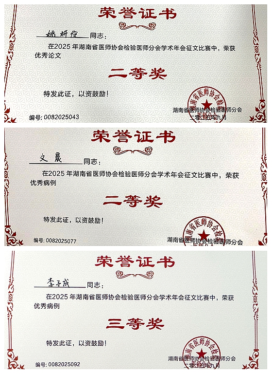 会上,湘雅常德医院检验科团队表现突出,一举斩获多项省级荣誉:在大会优秀论文评选环节中,检验科姚妍伶荣获优秀论文二等奖的优异成绩;在临床病例竞赛项目中,检验科文晨、李子成分别获得临床病例二等奖和三等奖的好成绩。