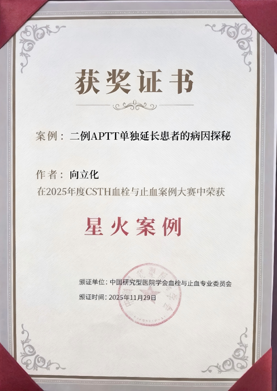 11月28-29日,中国研究型医院学会血栓与止血专业委员会(CSTH)在济南主办凝血规范化培训暨“血栓与止血案例大赛”。向立化提交的《二例APTT单独延长患者的病因探秘》分析两例“APTT延长却无出血”的患者,经实验室检测与临床资料整合,明确分别为凝血因子Ⅻ缺乏症、狼疮抗凝物(LA)阳性伴凝血Ⅻ因子活性降低,揭示相同检验表现的不同病因,助力临床决策,最终获“2025CSTH案例大赛星火奖”。