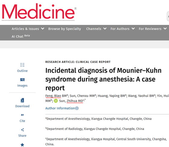 近日,湘雅常德医院麻醉手术部团队撰写的一篇罕见病例报告在国际期刊《Medicine》(JCR 4区,影响因子:1.4)正式发表。论文题为《Incidental diagnosis of Mounier-Kuhn syndrome during anesthesia: A case report》,全部作者均来自我院麻醉手术部,其中冯飚医师为第一作者,孙志华主任为通讯作者,湘雅常德医院为第一署名单位。