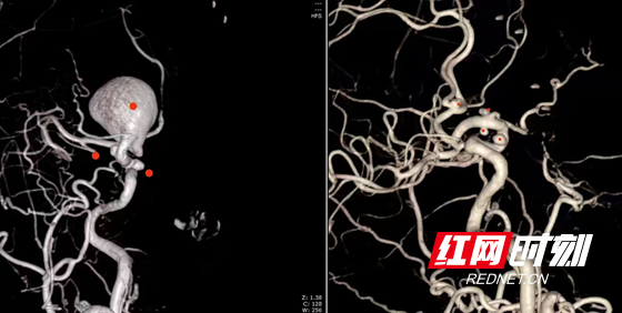 2025年10月,她再次找到湘雅常德医院神经外科刘景平教授复查。通过相关影像学检查结果显示:患者颅内不仅有一个2.6cm的脑膜瘤,还有1枚直径近3CM的巨大动脉瘤及6个多发小动脉瘤分布在颅内两侧血管。