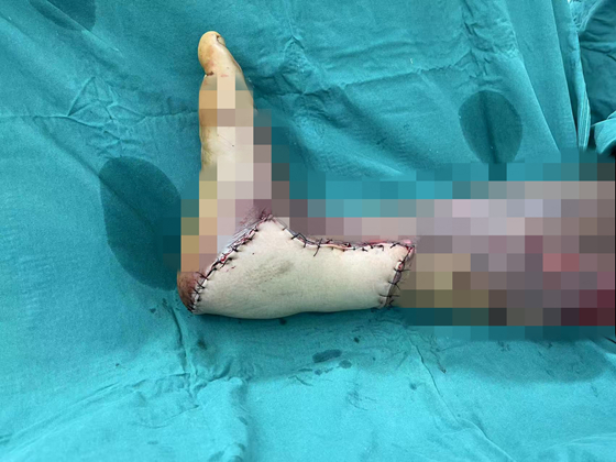 五天后,唐举玉教授主刀完成第二次手术——游离股前外侧穿支皮瓣移植,覆盖踝部创面,保护骨骼、血管与肌腱。他在指导手术时强调:“这类严重创伤的修复重建,不仅要求我们具备成熟的显微外科技术,更要有整体重建理念。患者右下肢毁损严重,创面大,出血多,危及患者的生命。在肢体重建方面,还需要采取创伤控制性理念。一期重建肢体血运后,要尽快调整好患者的全身情况,尽早实现创面的覆盖,避免长期创面外露刺激所重建的肢体血管,而影响肢体的血运。”手术团队巧妙地将患者自身大腿前外侧的皮瓣连同血管神经一并移植至踝部创面,完美覆盖了裸露的骨骼、血管及肌腱,为保肢提供了保障。