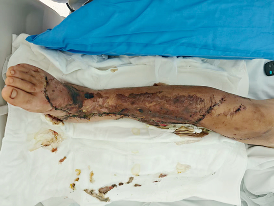 患者彭先生于工作中被工程车辆撞倒并碾压右下肢,造成膝关节以下皮肤完全套脱、大面积皮肤缺损,踝关节开放性骨折脱位,右小腿肌肉严重碾挫并血运障碍。当地医院诊断为Gustlio-Anderson IIIC型严重开放性损伤,告知唯有大腿中下段截肢一策。作为家庭支柱,患者无法接受这一结果,经120联系中南大学湘雅医院骨科寻求转院。