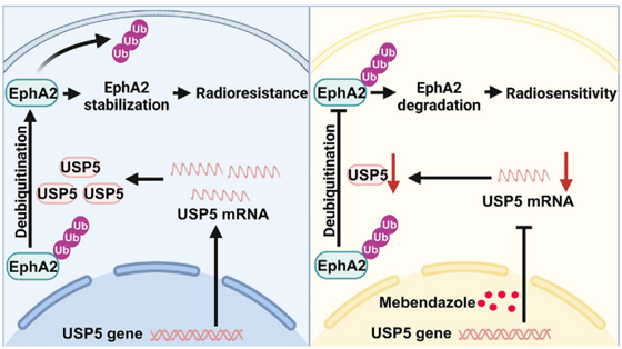 在《International Journal of Biological Sciences》杂志上发表题为“USP5 Binds and Stabilizes EphA2 to Increase Nasopharyngeal Carcinoma Radioresistance”的文章,该研究探讨了USP5通过泛素蛋白酶体途径稳定EphA2蛋白,从而增强鼻咽癌(NPC)放射抗性的机制,并发现驱虫药甲苯咪唑(MBZ)可通过靶向USP5/EphA2轴抑制NPC放射抗性。研究表明,USP5与EphA2相互作用并去泛素化稳定其表达,MBZ通过转录抑制USP5促进EphA2降解,且USP5/EphA2高表达与NPC放射抗性及不良预后相关,为NPC放射增敏治疗提供新靶点和策略。