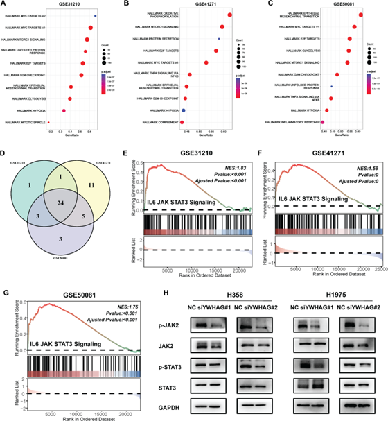 adenocarcinoma through the JAK2/STAT3 pathway”的文章,该研究探讨YWHAG在肺腺癌(LUAD)中的作用及机制。通过分析TCGA和GEO数据库、临床样本及细胞实验,发现YWHAG在LUAD中高表达,与不良预后及淋巴结转移相关,可作为独立预后因子和化疗/靶向治疗疗效预测标志物。功能实验表明,沉默YWHAG抑制LUAD细胞增殖、迁移并促进凋亡,其机制可能通过激活JAK2/STAT3信号通路实现。