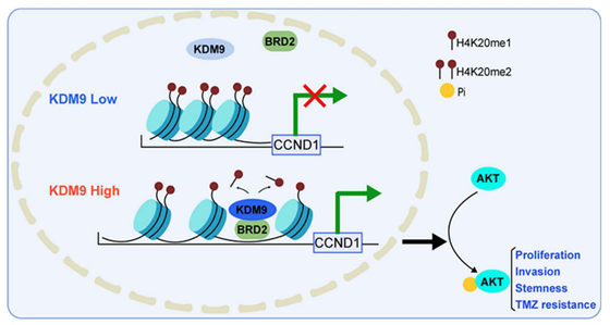 在《Cellular and Molecular Life Sciences》杂志中发表题为“Histone demethylase KDM9 activates the CCND1/AKT pathway to promote the malignant progression of gliomas through interaction with BRD2”的研究论文。该研究探讨组蛋白去甲基化酶KDM9在胶质瘤中的作用及机制。发现KDM9在恶性胶质瘤中高表达,通过介导CCND1启动子区H4K20me2去甲基化,并与转录因子BRD2相互作用促进CCND1转录,激活AKT信号通路,从而增强胶质瘤细胞的增殖、侵袭、干细胞特性及替莫唑胺(TMZ)耐药性。体内实验也证实敲低KDM9可抑制异种移植瘤生长和TMZ耐药,为胶质瘤提供潜在预测和干预靶点。