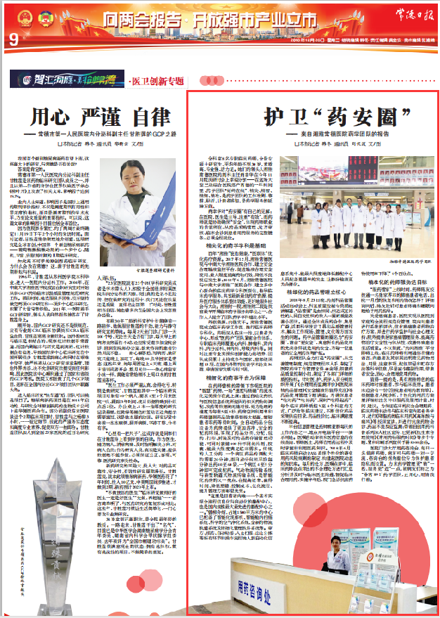 我院药剂科作为科技创新团队脱颖而出,得到市科技局认可并推广,近日相关媒体为此作了专版报道。护卫“药安圈”—— 来自湘雅常德医院药学团队的报告 □本报记者 韩冬 通讯员 刘伏波 文/图...